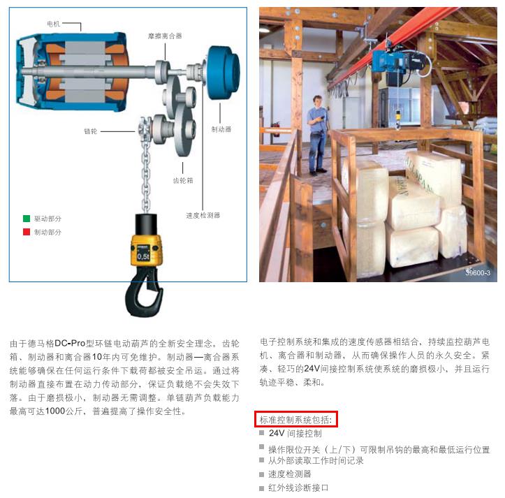 德国德马格进口环链电动葫芦采用齿轮限位开关作为运行限位开关,有四个触点,用于预限位和最终限位,可以放心使用,非常安全。